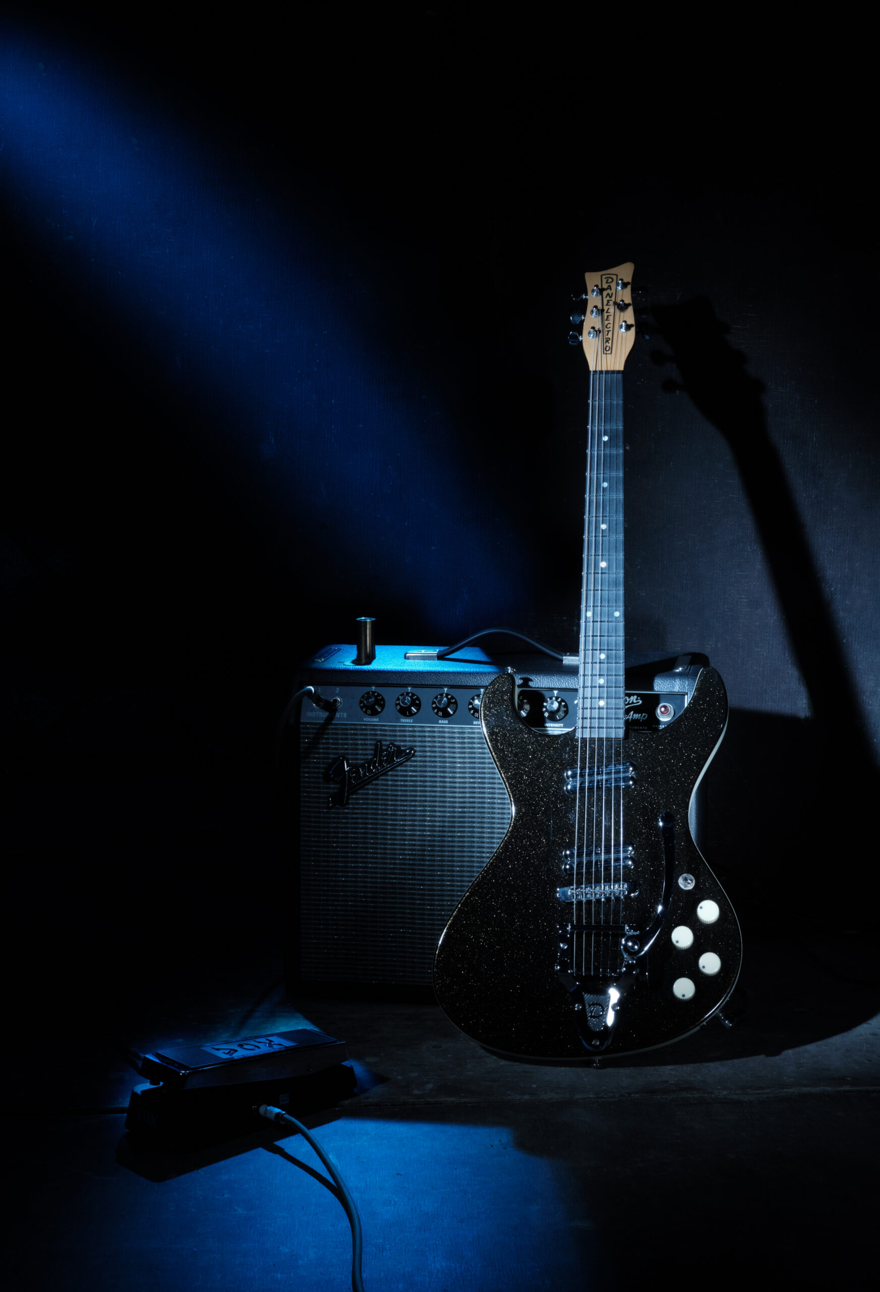 Die Danelectro Hodad ist die ideale Schönheit um fotografisch festgehalten zu werden. Das gold-schwarze Finish der Gitarre kommt mit dem richtigen Licht fantastisch zur Geltung. Zeitlos schön ist jedoch auch die silber-scharze Frontbespannung des Fender Verstärkers. Nicht nur der Ton macht es aus, auch das Design! Diese Bilder sind ein Projekt aus der cap Fotoschule womit ich einen Einblick in die Studiofotografie mit verschiedenen Lichtarten erhielt.